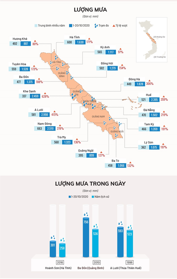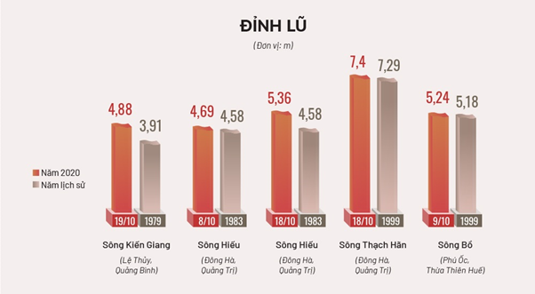 Đỉnh lũ cao nhất trên sông Kiến giang (huyện Lệ thuỷ, Quảng Bình) năm 1979 là 3,91m, nhưng ngày 19/10/2020 đã lên 4,88m, gây ngập lụt kéo dài. (Nguồn https://vnexpress.net)