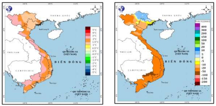 Hình 1: (a) Dự báo chuẩn sai nhiệt độ trung bình (0C) tháng 4/2024 và (b) dự báo chuẩn sai lượng mưa (mm) tháng 4/2024.