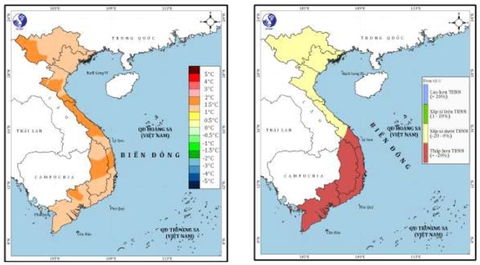+ Khu vực Tây Nguyên và Nam Bộ: Tháng 4/2024 TLM thấp hơn từ 30-60mm so với TBNN. Tháng 5/2024, TLM thiếu hụt so với TBNN khoảng từ 15-30%. Tháng 6 TLM phổ biến ở mức xấp xỉ so với TBNN cùng thời kỳ.