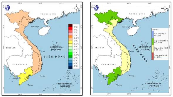 Hình 2: (a) Dự báo chuẩn sai nhiệt độ trung bình (0C) tháng 5/2024 và (b) dự báo tỷ chuẩn lượng mưa (%) tháng 5/2024.