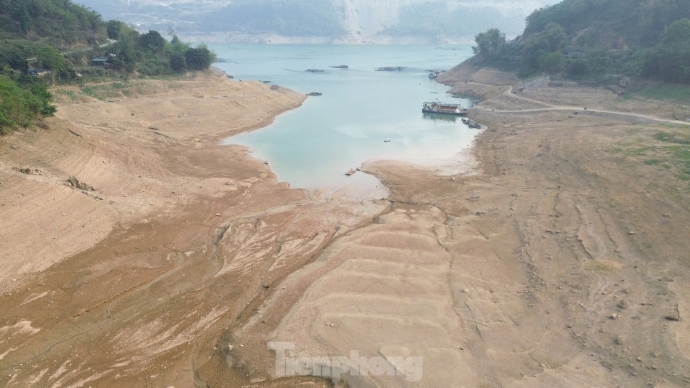 Do miền Bắc những tháng qua hầu như không có mưa lớn, mực nước lòng hồ thủy điện Hòa Bình hiện đã xuống thấp khoảng 30m so với cùng kỳ năm 2024. Nước hồ xuống thấp để lộ ra những bãi cát, vệt đất trắng, vàng men theo chân núi.